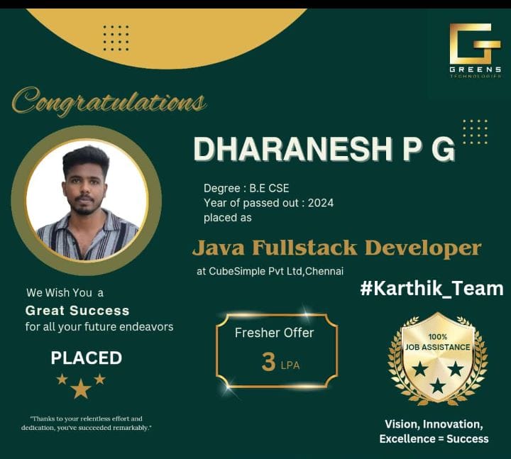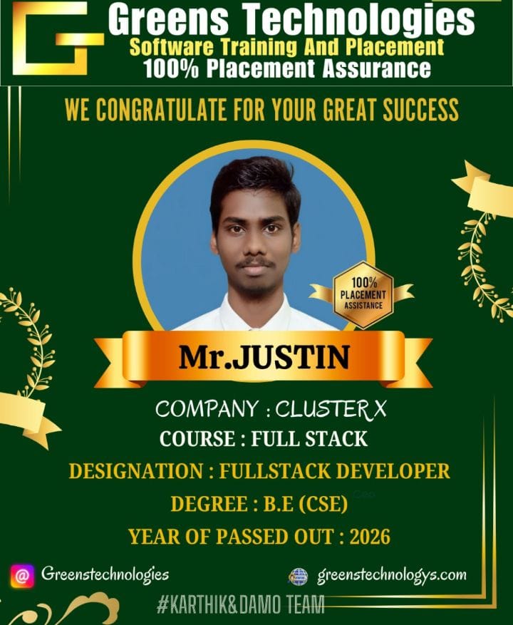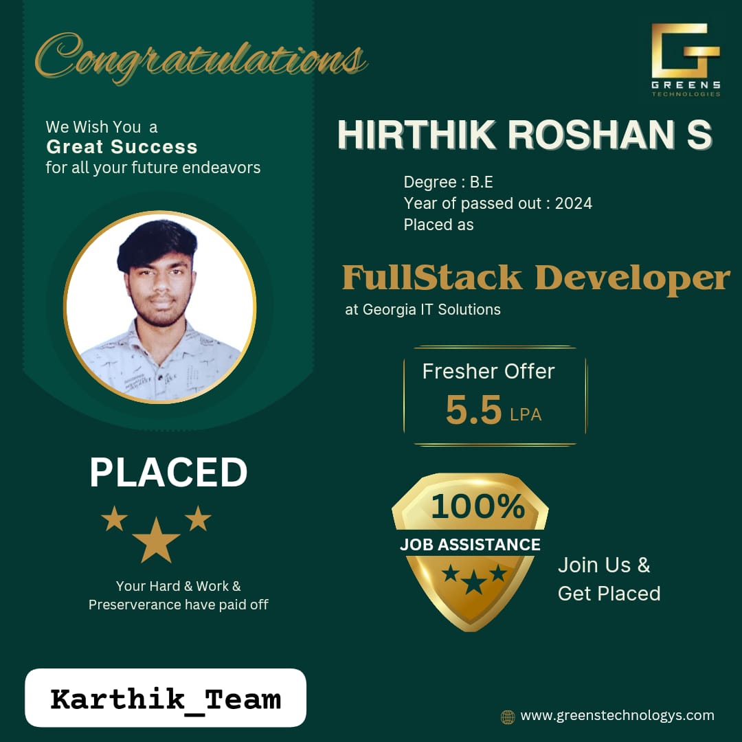 Greens Technologies IT training programs are designed to meet the needs of todayâs fast-changing world, making quality education accessible from anywhere. With our expert trainers and flexible learning options, we help students gain the skills they needâanywhere, anytime. Trusted by thousands, we are committed to Full Stacklence in transformation.